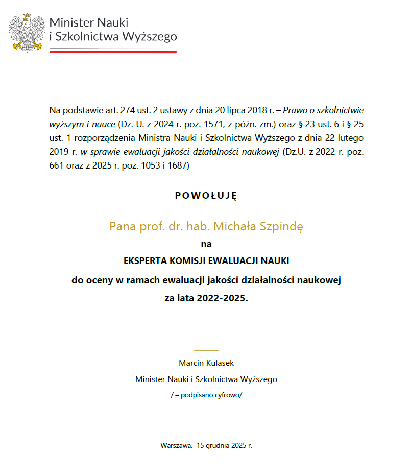 Powołanie do Komisji Ewaluacji Nauki - prof. Michał Szpinda